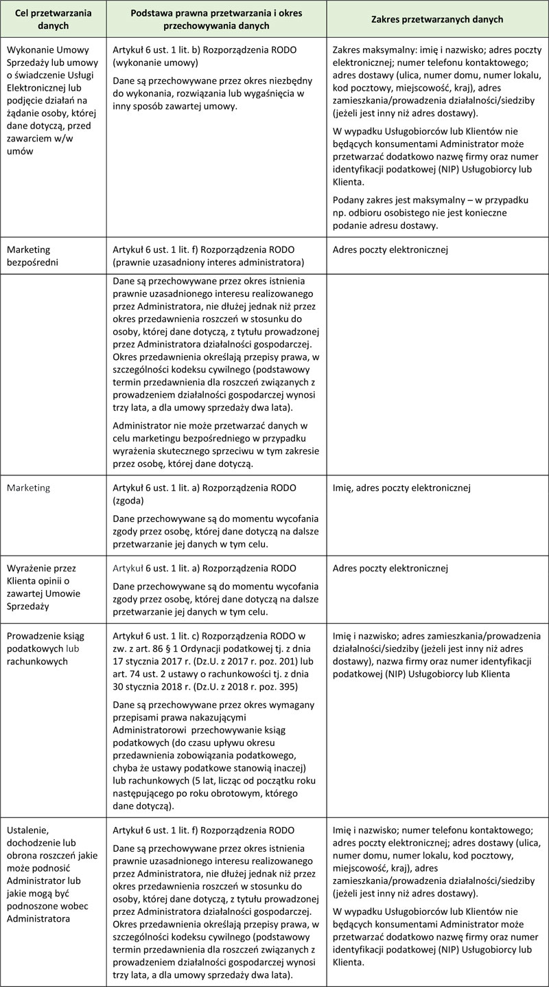 3.1. Każdorazowo cel, podstawa, okres i zakres oraz odbiorcy danych osobowych przetwarzanych przez Administratora wynika z działań podejmowanych przez danego Usługobiorcę lub Klienta w Sklepie Internetowym. Przykładowo jeżeli Klient decyduje się na dokonanie zakupów w Sklepie Internetowym i wybierze odbiór osobisty zakupionego Produktu zamiast przesyłki kurierskiej, to jego dane osobowe będą przetwarzane w celu wykonania zawartej Umowy Sprzedaży, ale nie będą już udostępniane przewoźnikowi realizującemu przesyłki na zlecenie Administratora.
